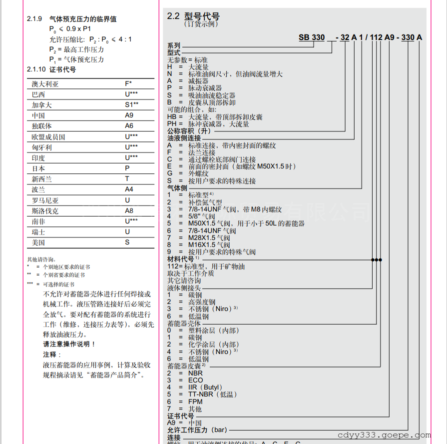 详细信息| 询价留言品牌:HYDAC贺德克 型号:SB330-20A1/112A9-330A 加工定制:否 适用机械:液压设备 重量:50 加工定制:否 德国HYDAC贺德克SB330系列蓄能器常规型号如下: