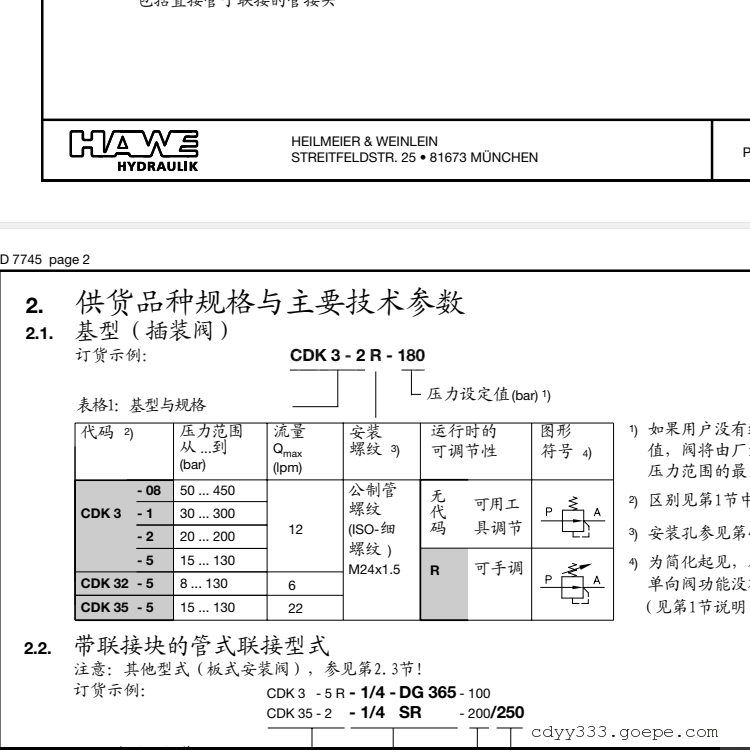 HAWE哈威CDK减压阀在液压系统中的主要功能,是在执行机构侧很大程度上保持某一恒定压力(次级压力),即使进口压力(初级压力)比较高和在变化。与通常的滑阀式减压阀(需要附加的泄漏油口)相比,CDK型阀是一种座阀式结构的二通阀,在关闭状态无泄漏,不用接泄油管。基型(螺纹插装阀):CDK 3型标准型,可用于各种场合。CDK 32型对泵的压力(进口压力)变化不敏感,能在较低压力下运行。〔注意:*大流量61/min )CDK 35型其有较小的流动想力生峰,1水.口压力)较敏感。这类阀之间的特性差别,归纳在第么.1p衣i,o人第"压力相关性"。如果P口初级压力低于A口的次级压力,则在阀开启状态,有可能出现A一>P的反向流动。这页的图形符号示例中已拮了单向阀,为了简化起见,在本样本的其它处省略。