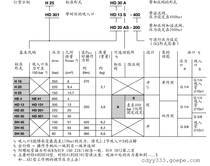液压辅件:蓄能器、冷却器、过滤器、放大器、压力继电器、压力传感器等HAWE哈威H型、HE型、HD型、DH型手动泵有单作用与双作用两种结构形式。单作用手动泵仅为手柄运动的一个方向供油,而手柄反向运动时为吸油动作。双作用手动泵在手柄往复运动时均为供油和吸油,派生型泵吸油侧可承受至150bar压力。此种手动泵可配置固定式手柄或拆卸式手柄,并可带油箱或不带油箱。装卸荷阀(P与S相通)与/或溢流阀可扩大其应用范围。